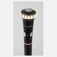 um 1900, aus Ebenholz gefertigtes Modell mit konisch zulaufendem Knauf, dieser verziert von eingesetzten Perlmuttcabochons und umlaufender Zahnleiste aus Bein, Messingzwinge, Altersspuren, H 84 cm.