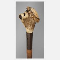 Ende 19. Jh., Griffstück aus beschnitztem Hirschhorn, als Hundepfeife gestaltet, Bronzemontierungen, Schuss aus Bambus, Hornzwinge, Alters- und Gebrauchsspuren, H 81 cm.