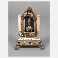 18./19. Jh., filigran gestaltetes Modell aus cremefarben gefasstem Stein, gravierten und polychrom bemalten Messingmontierungen sowie eingesetzten Cabochons aus Granat und Türkis, Mariendarstellung gerahmt von Engeln, Floralmotiven und allerlei weiterem Zierrat, Erhaltungsmängel, etwas rest.bed., H 11 cm.