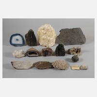 ca. 800 Stück, vorwiegend Gesteine, aber auch Fossilien und Mineralstufen wie Bergkristall, Achat und Rauchquarz, größtenteils einzeln verpackt in Kartons, wenige Fundortzettel, Fotos zeigen Auswahl von Mineralien, bitte vor Ort besichtigen. Provenienz: Kloster Buchsbaum.