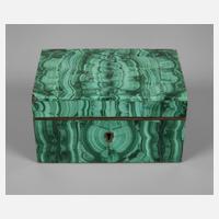 um 1910, massives Bronzegehäuse, fein belegt mit Malachitplättchen, das Innenleben in cremefarbener Seide ausgekleidet, Abdeckung des Bodens und Füße fehlen, eine Ecke bestoßen, ohne Schlüssel, Maße 5 x 9,5 x 6 cm.