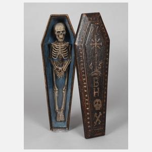 wohl Süddeutschland, datiert 1765 sowie monogrammiert BH, Weichholz beschnitzt und farbig gefasst, verglaster Korpus mit plastisch gearbeitetem Tödlein, Altersspuren, L 48 cm.