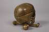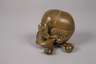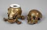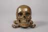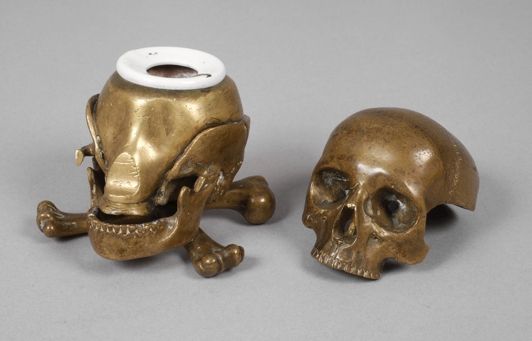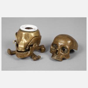 Anfang 20. Jh., Bronze mehrteilig gegossen und montiert, in Form eines menschlichen Schädels gearbeitetes Gehäuse mit abnehmbarem Deckel, Einsatz aus Weißporzellan mit Prägestempel Made in Bavaria, Altersspuren, H 9 cm.