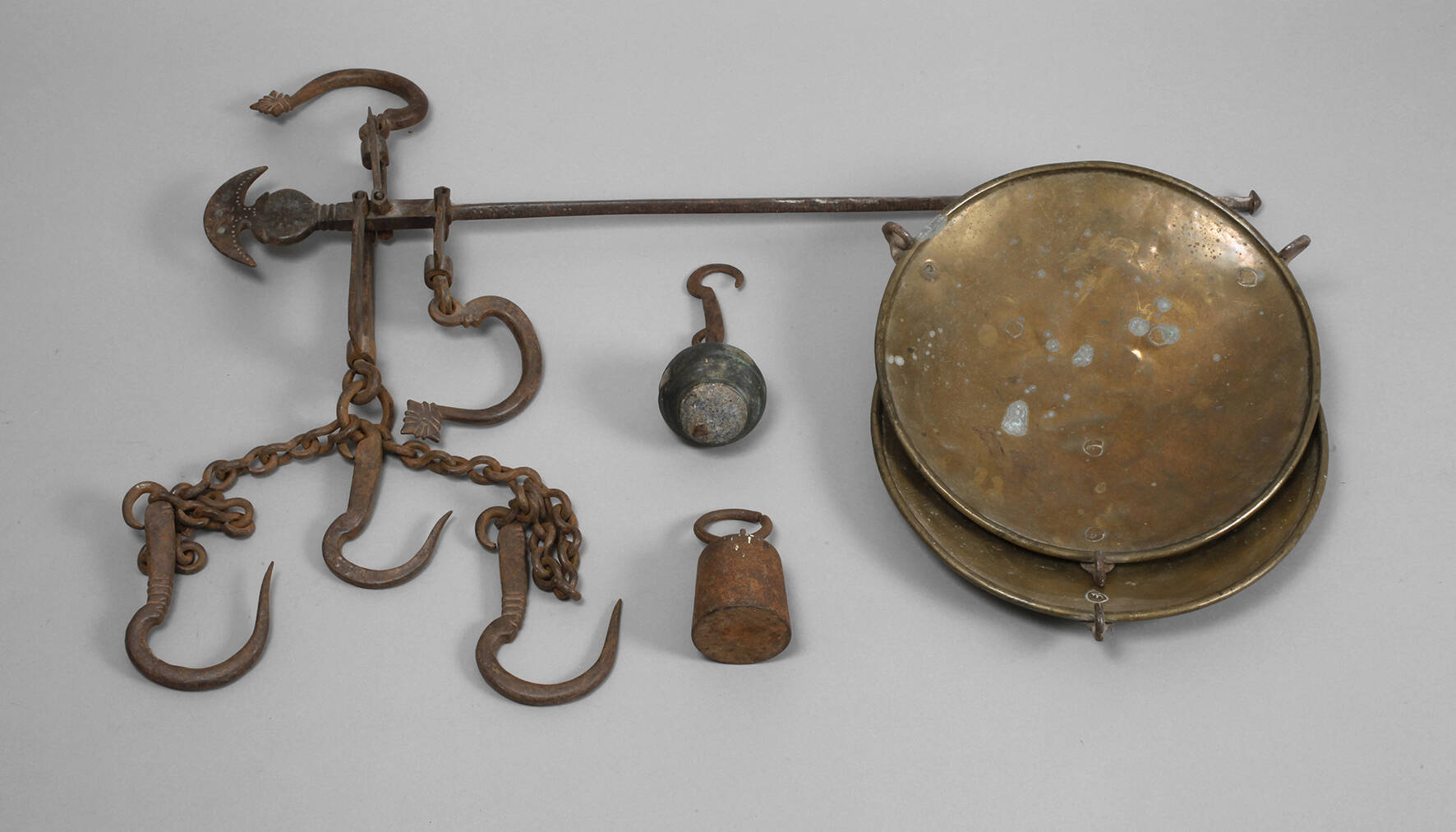 Italien, 17./18. Jh., Schmiedeeisen, mehrteilig gefertigt und montiert, teils ornamental punziert, schlanke Balkenwaage mit abgehängten Waagschalen aus Messingblech, beigegeben zwei Gewichte, Alters- und Korrosionsspuren, L ca. 72 cm.