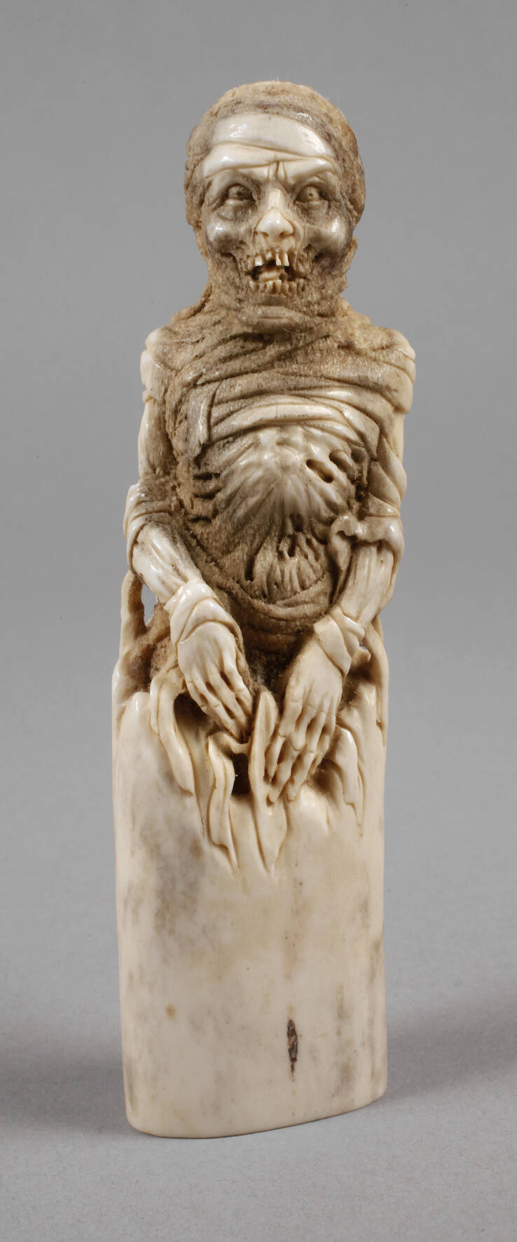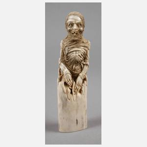 wohl 19. Jh., Bein überaus qualitätvoll beschnitzt, vollplastisch gearbeiteter Knochenmann als Halbfigur, Altersspuren, H 14,5 cm.