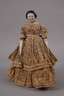 um 1870, ungemarkt, glasierter und fein bemalter Porzellan-Brustblattkopf mit geschlossenem Mund, blauen Augen, Lid- und Brauenstrich sowie schwarzer gescheitelter Frisur mit modellierten Locken, schlanker Stoffkörper mit Schlenkergliedern, Porzellan-Unterarmen und -Beinen mit gemalten Schuhen, original bekleidet mit Blümchenkleid, Unterrock und Unterwäsche, bespielter, guter altersgemäßer Zustand, rechter Zeigefinger gechipt und Kleidung partiell zerschlissen, L 39 cm.