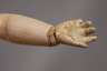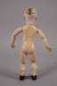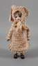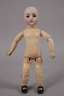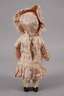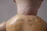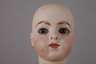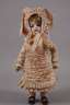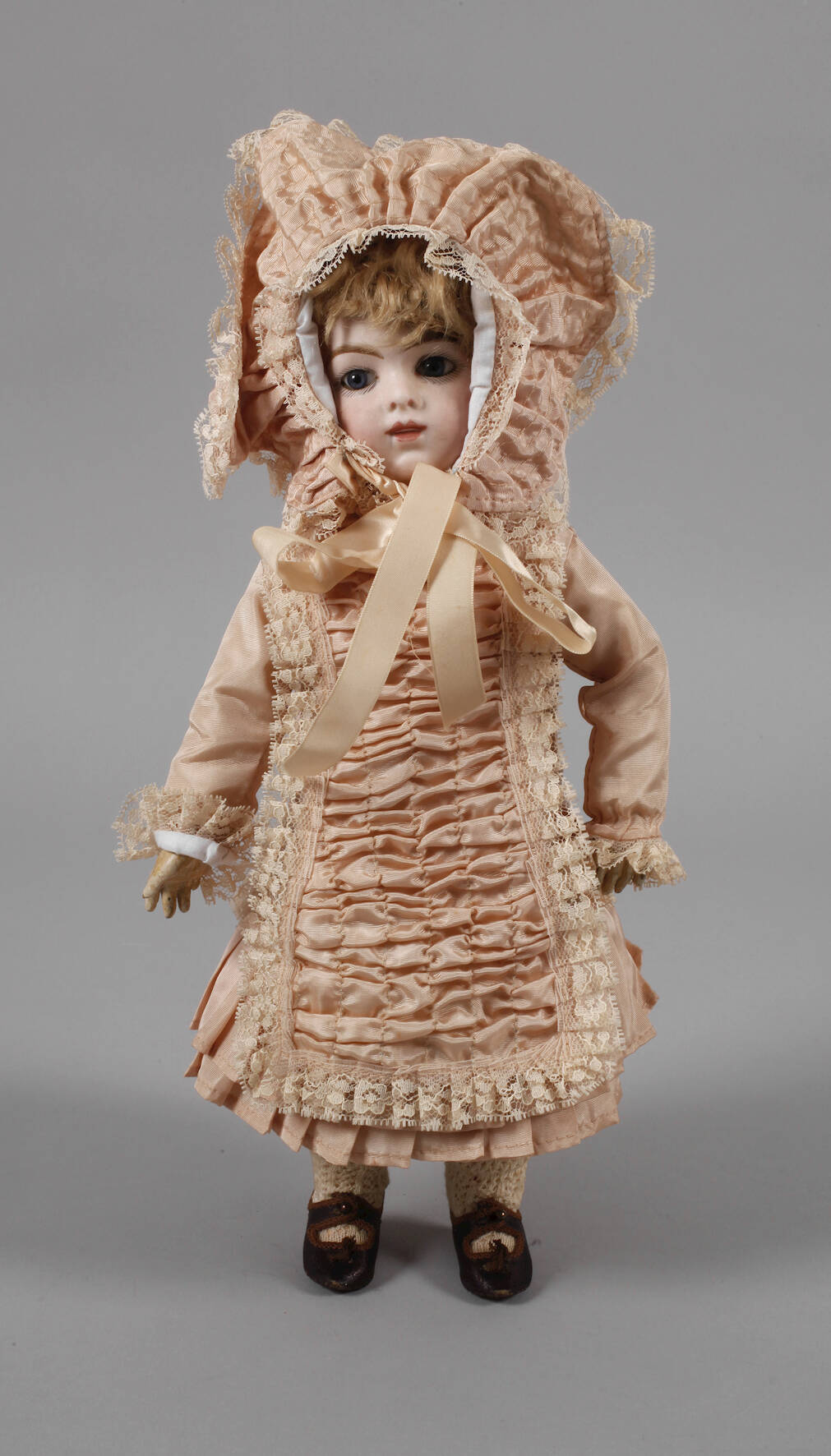 Léon Casimir Bru Paris, ab 1890, gemarkt Bru Jne 5, Körper gestempelt Bru Bébé No. 5, Biskuitporzellan-Kurbelkopf mit offen-/geschlossenem Mund mit Lippenkonturen und heller Aussparung, durchstochenen Ohrläppchen, fest eingesetzten blauen Paperweight-Glasaugen, gemaltem Wimpernkranz und gefiederten Brauen sowie blonder Mohairperücke, elfteiliger Gliedergelenkkörper aus Holz und Masse, Kleid und Haube im alten Stil sowie alte Unterwäsche, Strümpfe und Lederschuhe, guter sammelwürdiger Zustand, an der linken Schläfe fachmännisch restauriert, Korkdeckel lose, Körper minimal berieben und an der rechte Hand alt geklebt, Schuhe ohne Sohlen, L 36 cm.