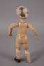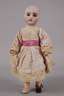 Emile Jumeau Paris, um 1880, gemarkt X 4, am Körper auf Firmenetikett bezeichnet Bébé Jumeau Diplome d'Honneur, Biskuitporzellan-Kurbelkopf mit schrägem Kopfanschnitt, offenem Mund mit Lippenkontur, vier Zähnen oben, durchstochenen Ohrläppchen, fest eingesetzten blauen Paperweight-Glasaugen, gemaltem Wimpernkranz und gefiederten Brauen, elfteiliger Gliederkörper aus Holz und Masse, altes rosé-weiß gestreiftes Kleid mit Spitzenbesatz und Spitzenunterhose, ohne Perücke und Ohrlöcher winzigst gechipt, Körper alt farblich übergangen, partielle Masseverluste und altes Klebeetikett mit Namensangabe Paul 7, L 35 cm.