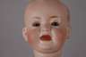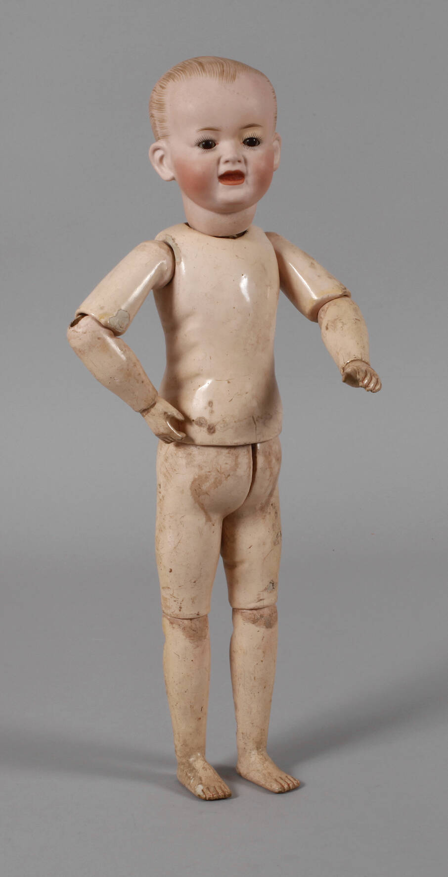 Charakterjunge um 1912, gemarkt 4 Germany K & H 525 (für Kley & Hahn), Biskuitporzellan-Kurbel-Vollkopf mit offen-/geschlossenem Mund, braunen Schlafaugen, gemaltem Wimpernkranz, gefiederten Brauen und blond gestricheltem Haarboden, an ungewöhnlichem Gliedergelenkkörper aus Pappmaché und Masse mit geteiltem Unterleib für Beinbewegung, bespielter Zustand, linkes Auge fachmännisch restauriert, Körper mit rückseitig geklebtem Bruchstück und kleinen partiellen Massefehlstellen, L 42 cm.