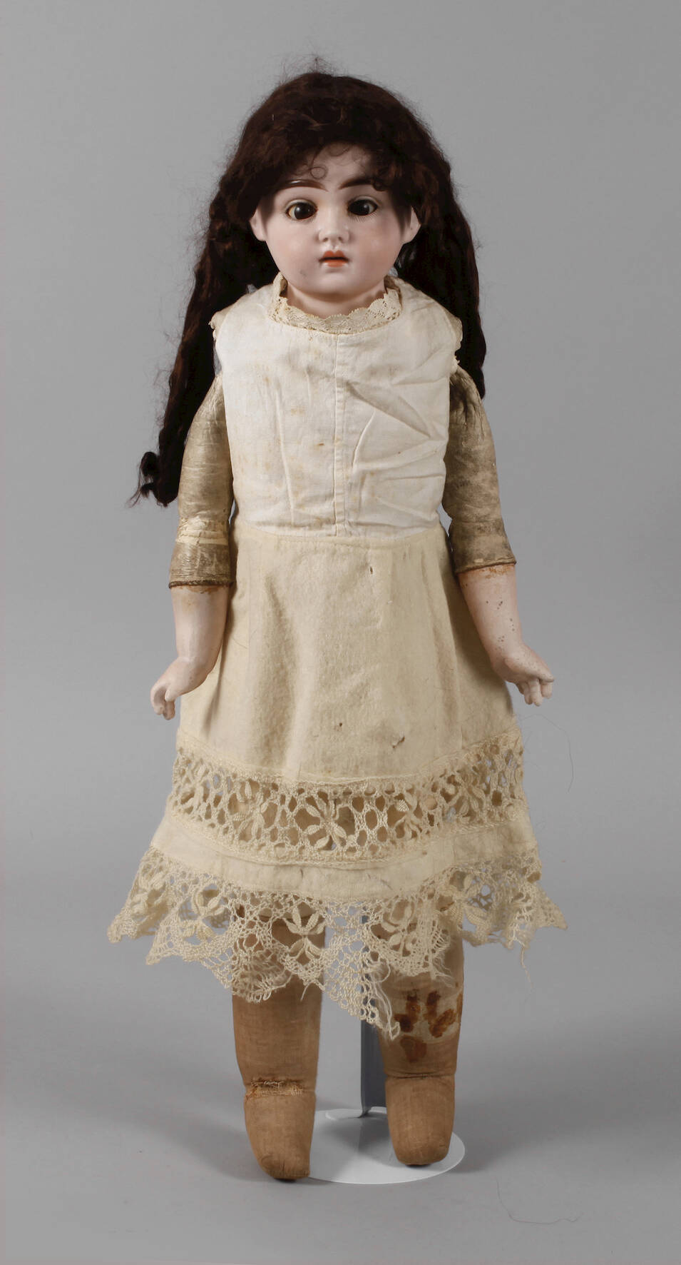 Mädchen um 1900, gemarkt Germany Logo, Biskuitporzellan-Brustblattkopf mit Kindergesicht, geöffnetem Mund, vier Zähnen oben, schielenden braunen Glasaugen, gemaltem Wimpernkranz, wulstartig modellierten Brauen und brauner Mohairperücke mit Zöpfen, Ziegenlederkörper mit Zwickel, Biskuitporzellan-Unterarmen und Unterbeinen aus Stoff, alt bekleidet, bespielter Zustand mit Altersspuren, Körper partiell alt restauriert, rechter Unterarm mit Brandfehlern, L 58 cm.