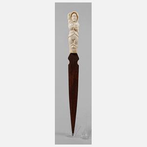 19. Jh., unsigniert, Bein beschnitzt, Griffstück in Form einer halbbekleideten, lasziv ausgestreckten jungen Frau, die Klinge aus dunkel gebeiztem Laubholz vermutlich später ergänzt, Altersspuren, L 24 cm.