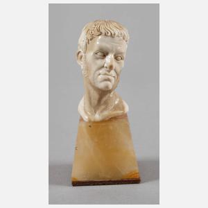Ende 19. Jh., unsigniert, Hirschhorn aufwendig beschnitzt, vollplastisch gestaltetes Kopfstück nach Vorbild einer antiken Büste, vermutlich Konterfei des Kaiser Nero, auf Onyxsockel montiert, leichte Altersspuren, H 8,5 cm.