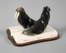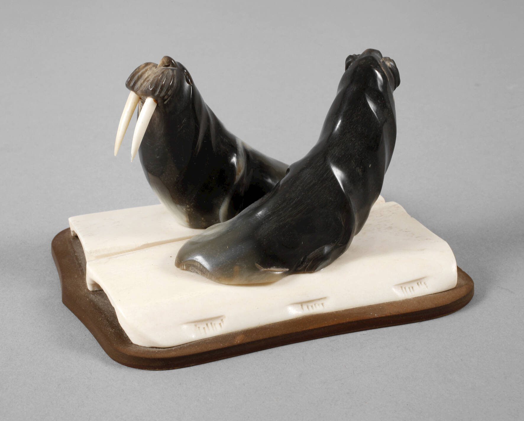 um 1920, unsigniert, aus Bein und Horn geschnitzte vollplastische Darstellung zweier Walrösser auf flacher Basis, gute Erhaltung, L 13 cm.