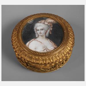 Ende 19. Jh., Metallguss vergoldet, Runddose mit scharniertem Deckel, umlaufend verziert von historisierenden Reliefs, Blütenranken und Perlbändern, im Deckel eingelassene verglaste Miniatur, Gouache auf Platte, mit Darstellung einer barocken Schönheit als Halbfigur, das Innenleben mit lindgrünem Samt ausgekleidet, Altersspuren, min. rest.bed., D 8,5 cm.