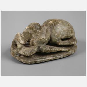 unbestimmten Alters, Speckstein beschnitzt, vollplastisch gearbeiteter Skarabäus als Grabbeigabe, an der Unterseite von Keilschrift verziert, Substanzverluste, Altersspuren, L 8,5 cm. Provenienz: Aus der Sammlung Heinrich Brugsch Berlin.
