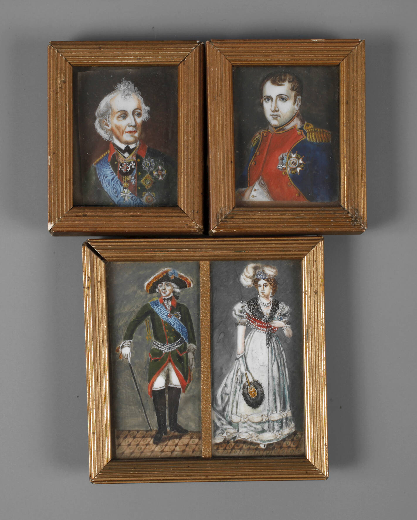 Ende 19. Jh., unsigniert, Gouache auf Platte, zwei kleinformatige Herrscherportraits als Bruststücke sowie ein Doppelportrait Friedrich des Großen und seiner Gattin Elisabeth Christine, hinter Glas in zarten Holzleisten gefasst, Altersspuren, L max. 7 cm.