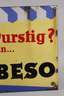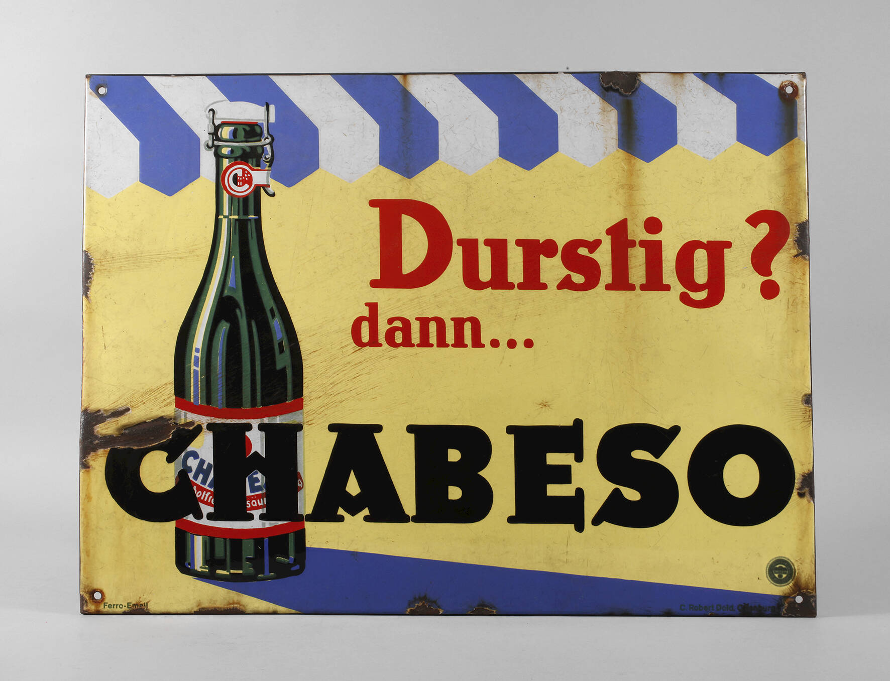 um 1920, Herstellervermerk Ferro-Email C. Robert Dold, langrechteckiges planes Schild, mehrfarbig emailliert, mit Umschrift und Werbesignet, vier originale Bohrungen, größere Emailleverluste im Randbereich, Craquelure, Rostspuren, Z 2-, Maße 59 x 77,5 cm.