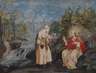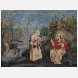 der Teufel erscheint Jesu und spricht "Wenn du Gottes Sohn bist, so befiehl diesem Stein, zu Brot zu werden." Jesus antwortete ihm: "In der Schrift heißt es: Der Mensch lebt nicht nur von Brot." (Evangelium nach Lukas, Kap. 4), Temperamalerei, um 1800, geringe Verluste und etwas wellig, unter Passepartout und hinter Glas gerahmt, Passepartoutausschnitt ca. 12,5 x 16 cm.