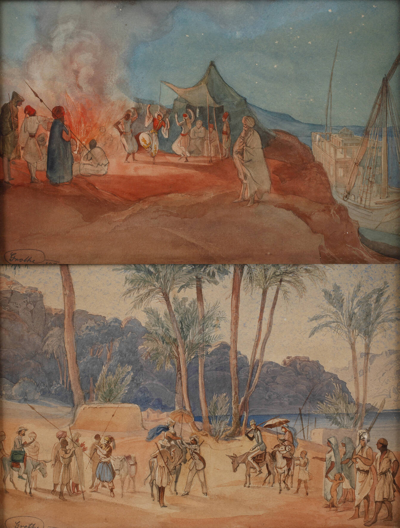 1.) Ankunft bei den Einheimischen, am Ufer eines Sees unter Palmen und 2.) tanzende Einheimische abends am Feuer, Aquarelle über Bleistift, jeweils links unten signiert und datiert "Grothe (1)847", hinter Glas gerahmt, Falzmaße ca. 16 x 23 cm.