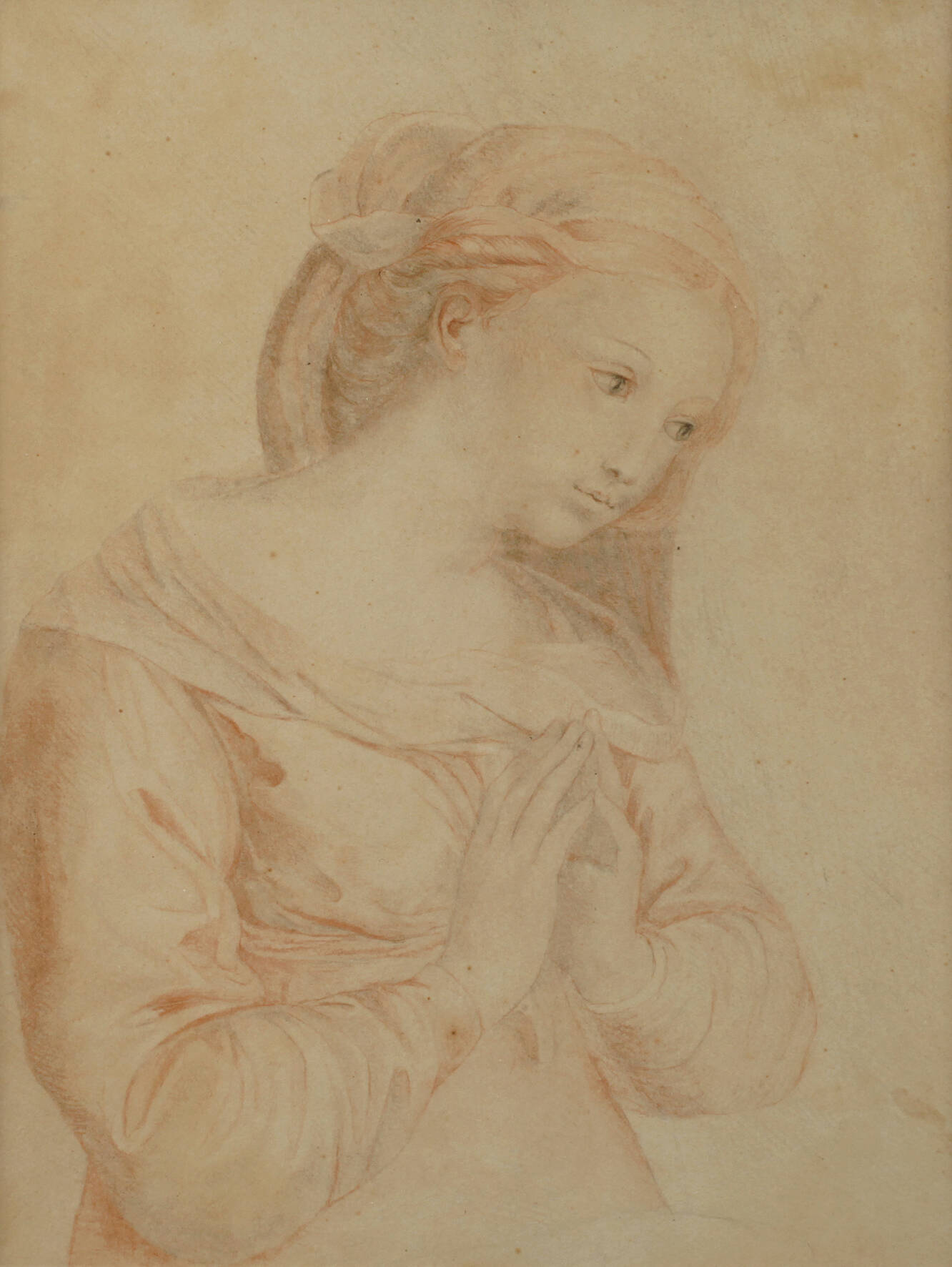 junge Frau, mit bedecktem Haar beim Gebet, Rötel und Graphit, 19. Jh., unter Passepartout und hinter Glas gerahmt, Passepartoutausschnitt ca. 25,5 x 19,5 cm.