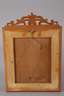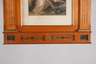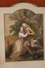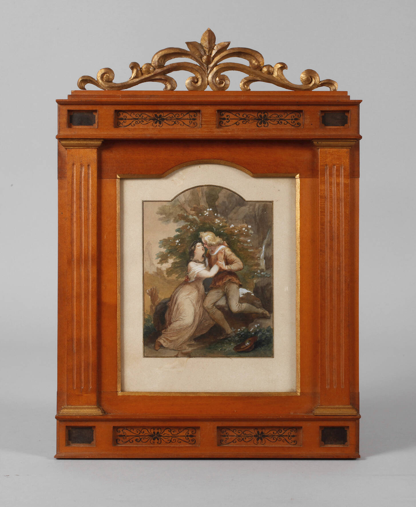 vor einem Baum auf einem Felsen und in der Nähe einer Quelle sitzendes, sich umarmendes Paar, Aquarell und Deckweiß über Bleistift und auf Unterlagekarton montiert, 2. Hälfte 19. Jh., kleiner Wasserfleck, hinter Glas in aufwendigem Portalrahmen, Bekrönung geklebt, Darstellungsmaße ca. 16 x 12 cm, Falzmaße ca. 22,5 x 17,5 cm.