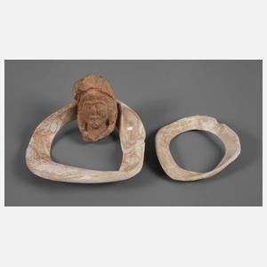 unbestimmten Alters, Kopfstück einer weiblichen Gestalt aus rötlichem Scherben, dazu zwei Muschelgeldringe, fragmentarische Erhaltung, Altersspuren, L max. 11 cm. Provenienz: Aus der Sammlung Heinrich Brugsch Berlin.