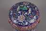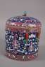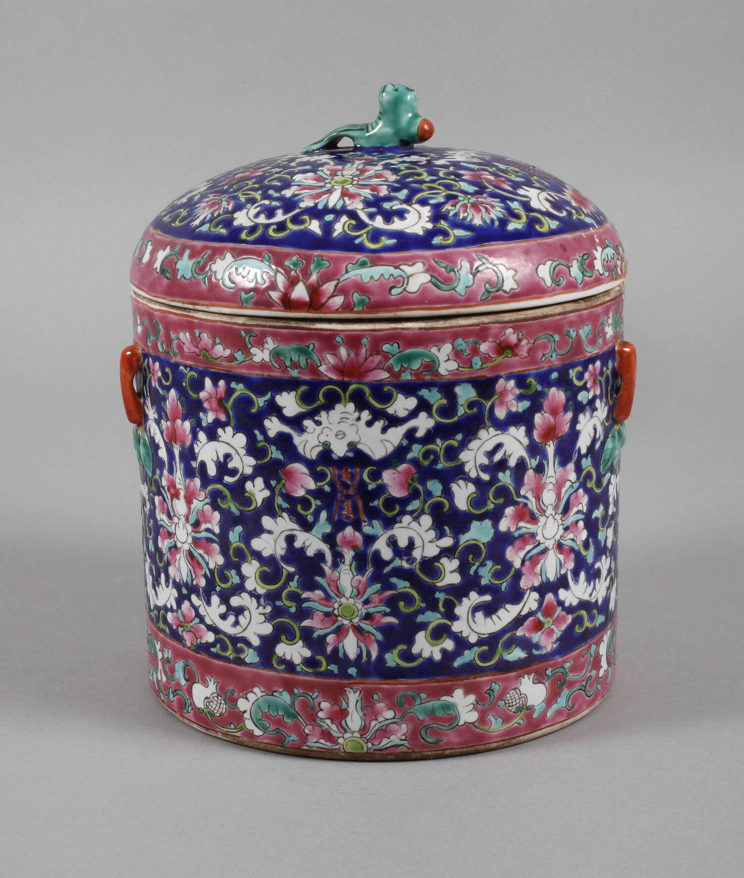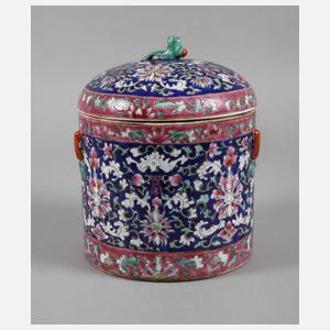 Anfang 20. Jh., ungemarkt, signiert, Porzellan in polychromer Emaillebemalung, zylindrischer Korpus mit abnehmbarem Kuppeldeckel, reich verziert von Rankwerk, halbplastischen Früchtemotiven und Fledermausdarstellungen, etwas berieben, H ca. 20 cm.