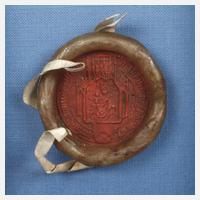 17.–18. Jh., wohl Universitätssiegel, rote Siegelmasse im Formring, Maria mit Jesuskind in gotischer Darstellung, unleserliche Umschrift, hinter Glas im Rahmen, guter Zustand, D ca. 5 cm, Maße Rahmen 19 x 22 cm.
