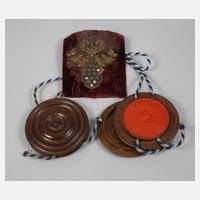 19. Jh., fein ausgesägtes und graviertes Familienwappen der Familie von Bülow, 14 goldene Kugeln auf blauem Grund (gefärbtes Leder), darüber der Helm und ein Pirol, der einen goldenen Ring im Schnabel hält, mehrere Fehlstellen im Wappenschild, den Helmdecken und der Helmzier, auf rot-violetten Samt montiert, H 12 cm, B 10,3 cm, dazu zwei Siegelkapseln, wohl für Leistungen in der Hundezucht, mit Siegelmasse gefüllte Nussbaumkapseln, darauf ein Hundekopf im Lorbeerkranz, darüber die Buchstaben F M als Ligaturmonogramm, durch die Siegelmasse verlaufen zwei weiß-blaue Kordelschnüre, altersgemäßer Zustand, D ca. 11 cm.