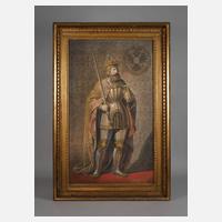 wohl Bildnis von König Ludwig IV. von Bayern (1282/86 bis 1347) in Rüstung mit Schwert und Reichsapfel in seinen Händen und Krone auf seinem Haupt sowie prächtig besticktem Umhang, rechts von ihm Doppeladler der Habsburger, jedoch mit bayerischem Wappenschild, die Schnalle des Umhangs ebenfalls mit bayerischem Wappen verziert, Gouache, teils mit Weißhöhung, auf bräunlichem Papier, um 1880, minimal angestaubt und berieben, hinter Glas im prachtvollen Rahmen der Zeit (geringe Erhaltungsmängel), Falzmaße ca. 99,5 x 60,5 cm, laut Auskunft des Einlieferers aus dem Nachlass von Alfons von Bayern.