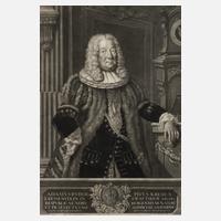 prachtvolles Bildnis des Adam Rudolf Kress von Kressenstein (1678 bis 1742) im Pelzmantel, im herrschaftlichen Interieur, unter der Darstellung Text in Latein, Mezzotintoradierung, Mitte 18. Jh., in der Platte unten rechts bezeichnet "Val. Dan. Preisler Sculps" (Valentin Daniel Preissler hat gestochen), unten links bezeichnet "J. L. Hirschmann effig. pinx." (Johann Leonhard Hirschmann hat gezeichnet und gemalt), minimal fleckig, unter Passepartout und hinter Glas gerahmt, Darstellungsmaße ca. 41 x 29 cm. Künstlerinfo: auch Preisler, dt. Kupferstecher (1717 Nürnberg bis 1765 ebenda), Sohn des Nürnberger Malers Johann Daniel Preissler, Lehre bei Bernhard Vogel, ging anschl. für zwei Jahre zu seinem Bruder nach Kopenhagen, führte die von Vogel begonnene Serie von Schabkunstblättern nach Johann Kupetzky fort und veröffentlicht diese 1745 in Nürnberg, Quelle: Thieme-Becker und Wikipedia.