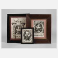 drei Portraits, Bildnisse von Johannes Friedrich Löffelholz von Colberg, Friedrich Beheim und Christoph Jakob Muffel von und zu Eckenhaid, Kupferstiche, 17. Jh., ein Blatt bezeichnet "Jacob Sandrart Sculp:", je unter Glas gerahmt, Passepartoutausschnitt max. 29,5 x 20 cm. Künstlerinfo: dt. Kupferstecher, Kunsthändler und Verleger (1630 Frankfurt am Main bis 1708 Nürnberg), 1635 Übersiedlung nach Hamburg und später nach Haag, 1640 Schüler seines Onkels, des Malers und Kupferstechers Joachim von Sandrart in Amsterdam, anschließend vier Jahre Kupferstecherlehre bei Cornelis I. Danckerts in Amsterdam, 1644–48 Kupferstecherausbildung bei Willem Hondius in Danzig, danach 1 ½-jährige Reise über Thorn, Breslau und Wien nach Regensburg, ab 1656 in Nürnberg ansässig, 1662 Gründung der „Maler-Akademie“ (heute Akademie der Bildenden Künste Nürnberg), zu deren erstem Direktor er zusammen mit Georg Christoph Eimmart dem Jüngeren ernannt wird, Quelle: Thieme-Becker und Wikipedia.