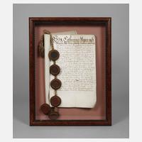 wohl 17. Jh., Testament der Schwestern Katharina, Anna und Maria, alle drei geborene Fräulein von Preysing, ... bekennen hiermit im offenen Brief und tun Kund ..., handgeschriebener Brief auf Pergament über ca. sechs Seiten, mit sechs Siegeln, hinter Glas im Rahmen, altersgemäßer Zustand, Maße Brief ca. 22 x 33 cm.