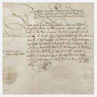 datiert 18. Oktober 1548, handgeschriebener Brief auf Bütten, "Wir Ferdinand von Gottes Gnaden König...", "... Ihro Königl. Majestät Ferdinand I. Römisch. Khönig Beurk. crafft dies dem Herrn Pankratzen von Freyburg zu Dachau, wegen seiner in der Grafschaft Tyroll habenden Besitzungen als gebührend und Billichkeit gehandelt werden solle...", altersgemäßer Zustand, hinter Glas im Rahmen, Maße Brief, 32 x 44 cm.