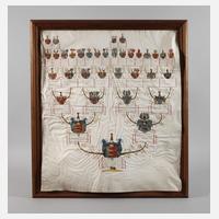 wohl 17. Jh., Darstellung der Vorfahren von "Maria Johanna Elisabetha Rosa Reichsfreyin... von Baltzheim, nunmehro Freiyin Schmid von Haslach", prachtvoller Baum mit 33 Wappen, teils mit Gold gehöht, in sechs Ebenen, Guache auf Bütten, Faltlinien – hier geringe Einrisse, unter Passepartout und hinter Glas gerahmt, Passepartoutausschnitt 35,5 x 48 5 cm.