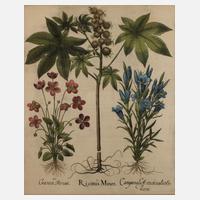 prachtvolle Darstellung verschiedener Kräuter wie Rizinus und Glockenblume, rückseitig typographischer Text, aus Hortus Eystettensis, kolorierter Kupferstich, erstmals erschienen 1613, leicht gebräunt, unter Passepartout und hinter Glas gerahmt, Plattenmaße ca. 48 x 40 cm. Info: auch Basil Besler, deutscher Apotheker, Botaniker und Verleger (1561 Nürnberg bis 1629 ebenda), Betreiber der Nürnberger Apotheke „Zum Marienbild“ mit Naturalienkabinett und Botanischem Garten, 1597 erhielt er von Johann Konrad von Gemmingen Bischof von Eichstätt den Auftrag zur Anlage eines Botanischen Gartens auf der Willibaldsburg unter Mitwirkung von Carolus Clusius, Jochim Camerarius und Ludwig Jungermann, 1613 erschien sein botanischer Prachtband „Hortus Eystettensis“, Quelle: Wikipedia.