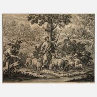 Jesus mit Hirtenstab inmitten einer Schafherde, in leicht hügeliger Landschaft, Kupferstich, Mitte 18. Jh., unter der Darstellung in der Platte bezeichnet rechts "Philipp Andreas Kilian sculpsit A. V." und links "Joh. Lor. Haid inc. et del.", leicht gebräunt und Loch in der Darstellung, unter Passepartout und hinter Glas gerahmt, Darstellungsmaße ohne Schrift ca. 23 x 30 cm. Künstlerinfo: dt. Kupferstecher (1714 Augsburg bis 1759 ebenda), Sohn und Schüler des Georg Kilian, auch Lehre bei Johann Andreas Friedrich, ging um 1730 für zwei Jahre nach Nürnberg zu dem Stecher Georg Martin Preißler, 1744 Ernennung zum königlich-polnischen und kurfürstlich-sächsischen Hofkupferstecher, Quelle: Thieme-Becker und Wikipedia.