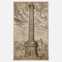 Ansicht der zu Ehren des römischen Stadthalters Trajan um 112–13 errichteten Säule mit Figurenstaffage unter leicht bewölktem Himmel, in der Darstellung handschriftliche Notate, Kupferstich, in der Darstellung unten signiert, bezeichnet und datiert "Ant. Lafreri seqvani Fomis Romae 1544", fleckig und saubere Faltlinien, auf Unterlagekarton und hinter Glas, Darstellungsmaße ca. 48,5 x 29,5 cm, Blattmaße ca. 50,5 x 31 cm. Künstlerinfo: auch Antoine Lafréry, in Rom ansässiger französischer Verleger, Kartenhändler und Drucker sowie vermutlich auch Kupferstecher (1512 Orgelet/Frankreich bis 1577 Rom), Herausgeber der sogenannten „Lafreri-Atlanten“, um 1540 Herausgabe einige Drucke mit Ansichten des antiken Roms, nach 1548 Herausgabe der über 130 Stiche umfassenden Serie „Speculum romanae magnificentiae“ (Ein Spiegel von der Pracht Roms), um 1570 Herausgabe einer Kartensammlung, Quelle: Thieme-Becker und Wikipedia.