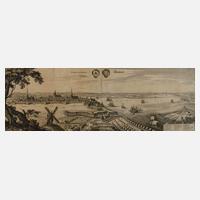 Blick aus der leichten Vogelschau, auf die Stadt mit ihren Befestigungsanlagen, oben mittig neben Wappen bezeichnet "Stralsundia" und „Stralsundt", rechts unten Legende, Kupferstich von zwei Platten, um 1650, auf Unterlagekarton kaschiert, mittig Bugfalte, rechts unten geringer Verlust, leicht braunfleckig, unter Passepartout und hinter Glas gerahmt, Darstellungsmaße ca. 27,5 x 71,5 cm. Künstlerinfo: auch Caspar M., bedeutender dt. topographischer Kupferstecher und Verleger (1627 Frankfurt am Main bis 1686 Schloss Waltha Westfriesland), entstammt dem Frankfurter Zweig der aus Basel stammenden Kupferstecherfamilie Merian, Sohn und Schüler des Matthäus Merian dem Älteren, als Mitarbeiter seines Vaters zeitweilig in Paris und Nürnberg, führte nach dem Tod seines Vaters 1650 zusammen mit seinem Bruder Matthäus dem Jüngeren dessen Verlag weiter, der noch bis 1727 existierte, 1672 auf ärztliches Anraten Rückzug nach Wertheim, 1677 Anschluss an die Labadisten und Übersiedlung nach Schloss Waltha in Westfriesland (Holland), Quelle: Internet, Thieme-Becker und Internet.