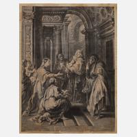 dargestellt wird die Szene, als Jesus, wie jeder erstgeborene Sohn, 40 Tage nach der Geburt im Tempel präsentiert wird und mit einem Opfer ausgelöst wurde, siehe Hollstein 4-2(4), Kupferstich, im unteren Bereich bezeichnet und datiert "P. Rubens invent P. Pontius Sculpsit A 1638", auf Unterlagepapier moniert, gebräunt, Einrisse im Randbereich, kleiner Verlust, Oberfläche partiell berieben und einige Farbspritzer, Darstellungsmaße 63,5 x 49 cm, Blattmaße ca. 64,3 x 49 cm. Künstlerinfo: flämischer Kupferstecher und Maler (1603 Antwerpen bis 1658 ebenda), ab 1616 Lehre bei dem Stilllebenmaler Osias Beert, Schüler und Mitarbeiter des Kupferstechers Lucas Vorsterman, 1626/27 Aufnahme als Meister in die Lukasgilde Antwerpen, Pontius zählt neben Boetius à Bolswert; Schelte à Bolswert und Vorsterman zu den führenden Reproduktionsstechern nach Werken von Peter Paul Rubens, 1624–31 wohnte Rubens mit in seinem Haus, Quelle: Wikipedia.