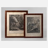 1.) Johann Elias Riedinger, Hirsch in einem Bach, Kupferstich, rechts unten in der Platte bezeichnet "J. El. Ridinger del. sc. et. exud. 1741", Darstellungsmaße ca. 35 x 27 cm und 2.) Martin Elias Riedinger, Hirsch vor einem Gatter, Kupferstich, rechts unten in der Platte bezeichnet "Martin El. Ridinger sculp." und "Joh. El. Ridinger inv. et. exe. Aug. Vind." Darstellungsmaße ohne Schrift ca. 29,8 x 23,8 cm, jeweils fleckig und hinter Glas gerahmt. Künstlerinfo Johann Elias Ridinger: dt. Maler, Graphiker und Verleger (1698 Ulm bis 1767 Augsburg), Schüler seines Vaters Johann Ridinger, ab ca. 1711 Schüler des Malers Christoph Resch in Ulm, ab 1713–14 bei Johann Falch in Augsburg, durch Vermittlung von Gabriel Spitzel drei Jahre im Diensten Graf Metternichs in Regensburg, ab ca. 1718 Schüler der Augsburger Stadtakademie bei Georg Philipp Rugendas dem Älteren, hier 1757 zum “Assessor des evangelischen Ehegerichts” und 1759 zum Direktor der Stadtakademie ernannt, wurde durch Tier- und Jagddarstellungen berühmt, die einen Hauptteil seines Schaffens ausmachten, Quelle: Thieme-Becker, Wikipedia und Internet. Künstlerinfo Martin Elias Ridinger: dt. Kupferstecher und Verleger (um 1730 Augsburg bis 1780 ebenda), Sohn und Nachfolger im Verlag des Johann Elias Ridinger, Schüler seines Vaters und bei J. J. Preißler in Nürnberg, tätig in Augsburg, Quelle: Thieme-Becker.