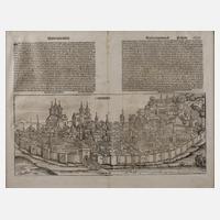 Blick aus der Vogelschau auf Erfurt mit seinen Befestigungsanlagen, gut zu erkennen ist der Domberg mit Severikirche und der Erfurter Dom, oberhalb der Darstellung Text in Latein, aus der "Schedelschen Weltchronik", Holzschnitt von zwei Stöcken und Buchdruck, rückseitig ebenfalls Text, erstmals erschienen 1493, mittig übliche Bugfalte, vorwiegend im Text etwas braunfleckig, hinter Glas gerahmt, Darstellungsmaße ohne Schrift ca. 22,5 x 52 cm, Falzmaße ca. 46,5 x 60 cm. Künstlerinfo: dt. Arzt, Humanist und Historiker (1440 Nürnberg bis 1514 ebenda), stammte aus den sogenannten Ehrbaren Familien von Nürnberg, 1456, bereits mit 16 Jahren, Studium an der Universität Leipzig, 1461 schloss er sich dem humanistischen Kreis um Peter Luder an, 1463 Reise nach Padua, und hier Studium der Medizin, Chirurgie und Anatomie an der Universität, 1466 Rückkehr nach Nürnberg, 1470–77 Stadtarzt von Nördlingen, ab 1477 Stadtarzt von Amberg, ab 1482 als Arzt wieder in Nürnberg ansässig, 1493 Herausgabe der Schedelschen Weltchronik, Quelle: Wikipedia.