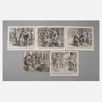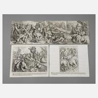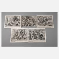 fünf Blatt mit mythologischen Themen, wohl aus der Folge Odyssee, zwei Blatt unter der Darstellung mit lateinischem Text, in der Darstellung nummeriert 22, 23, 25, 26 und 27, Kupferstiche, um 1630-35, wohl etwas spätere Abzüge, jeweils in der Darstellung monogrammiert "TvT", rückseitig Spuren alter Montierung, geringe Erhaltungsmängel, Darstellungsmaße max. ca. 19,5 x 25 cm. Künstlerinfo: auch Tulden, niederländischer Maler, Zeichner und Kupferstecher (1606 Herzogenbusch bis 1669 ebenda), ab 1621 Schüler von Abraham Blyenburch, nachfolgend Schüler von Peter Paul Rubens, ab 1626 Freimeister der Lukasgilde, deren Vorsteher er 1638-39 war, 1631/33 in Paris nachweisbar, 1635 heiratet er das Patenkind von Peter Paul Rubens, die Tochter des Malers Hendrik van Balden, ab 1635 übernimmt er im Auftrag von Antwerpen die Herausgabe des 43 Tafeln umfassenden Prachtbands zur Erinnerung an die von Peter Paul Rubens entworfene Festdekoration zum Einzug des Statthalters Kardinal Ferdinand, 1636 wird er Bürger von Antwerpen, von 1643 bis zu seinem Tod wieder in seiner Geburtsstadt ansässig, Quellen: Thieme-Becker und Internet.