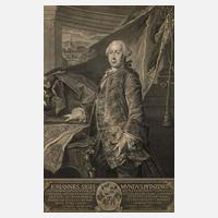 gestochen von Adam Ludwig Wirsing (dieses Blatt wird in Thieme-Becker erwähnt), Darstellung des letzten Abkömmlings des Adelsgeschlechts von und zu Henfenfeld (daher unten mittig das auf dem Kopf gestellte Wappen), an einem Tisch mit Ansichten von Gundlach und Henfenfeld stehend, von Henfenfeld war erster Bürgermeister von Nürnberg, kaiserlicher Burgvogt, Bewahrer der Reichsinsignien und wahrer kaiserlicher Rat, er lebte von 1712 bis 1764, Kupferstich, um 1765, gleichmäßig minimal gebräunt, unter Passepartout und hinter Glas gerahmt, Passepartoutausschnitt ca. 49,5 x 32,5 cm. Künstlerinfo: dt. Kupferstecher und Verleger (1733/34 Dresden bis 1797 Nürnberg), stach vor allem nach Barbara Regina Dietzsch, ab 1760 in Nürnberg ansässig und Kauf der Kunsthandlung G. D. Heumann, Quelle: Thieme-Becker.