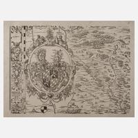links fast die gesamte Bildhälfte einnehmendes Wappen von Bayern, Tafel fünf der von Jost Amman geschnittenen "Großen Bayernkarte", Holzschnitt, geschnitten um 1568, schöner sauberer Druck, minimal fleckig, unter Passepartout und hinter Glas gerahmt, Darstellungsmaße ca. 31 x 42 cm. Info: eigentlich Bienewitz oder Bennewitz, dt. Arzt, Kartograph, Mathematiker und Heraldiker (1531 Ingolstadt bis 1589 Tübingen), Sohn des Peter Apian, bereits mit sieben Jahren gemeinsamer Unterricht mit Prinz Albrecht von Bayern (Albrecht Herzog V. von Bayern), mit elf Jahren Mathematikstudium an der Universität Ingolstadt, mit achtzehn Jahren Fortsetzung seines Studium in Burgund, Bourges und Paris, 1552 Rückkehr nach Ingolstadt und Übernahme der Druckerei des Vaters sowie Ernennung zum Professor für Mathematik und Astronomie an der Universität Ingolstadt, parallel zur Lehrtätigkeit Besuch von Vorlesungen an der medizinischen Fakultät, 1554 erteilte ihm Herzog Albrecht V. von Bayern den Auftrag zur Erstellung einer Bayernkarte, 1563 wurde die Karte von 6 x 6 Metern fertiggestellt, ab 1566 gab Apian 24 von Jost Amman in Holz geschnittene Bayernkarten heraus, die sogenannten Bairischen Landtafeln, da er Protestant war, musste er im Zuge der Gegenreformation Ingolstadt 1569 verlassen und ging nach Tübingen, hier lehrte er bis 1583, Quelle: Thieme-Becker und Wikipedia.