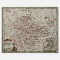 links unten Kartusche und hierin bezeichnet "Die Grafschaft Schwarzburg Rudolstadt oder der Grafschaft Schwarzburg Südlicher Theil Nro. 381", Darstellung des Gebiets zwischen Kranichfeld im Norden, Orlamünde im Osten, dem Fluss Schwarza im Süden und Ohrdruf im Westen, erschienen in "Schauplatz der fünf Theihle der Welt" als Karte Nr. 381, Wien um 1790, kolorierter Kupferstich, minimal fleckig, unter Passepartout und hinter Glas gerahmt, Darstellungsmaße ca. 27 x 32 cm. Künstlerinfo: österreichischer Verleger, Kartograf, Buchhändler und Schriftsteller (1766 Wien bis 1820 ebenda), Sohn des aus Russland stammenden Hofmeisters Johann Reilly, zunächst für drei Jahre unbezahlt tätig im österreichischen Staatsdienst, 1789 mit väterlichem Erbteil Hinwendung zur Geographie und Gründung des "Landkarten- und Kunstwerke-Verschleiß-Komptoir“, brachte infolge zahlreiche wegweisende Atlaswerke heraus wie 1789–1806 "Schauplatz der fünf Theile der Welt", 1791–92 den "Schul Atlas", 1792–93 die "Allgemeinen Erdbeschreibung", 1794–96 den "Grossen deutschen Atlas" und 1799 den "Allgemeinen Post Atlas von der ganzen Welt", anschließend wandte er sich der Schriftstellerei zu und veröffentlichte zahlreiche Werke, tätig in Wien, Quelle: Biographisches Lexikon des Kaisertums Österreich, Österreichisches Biographisches Lexikon, Deutsche Biographie und Internet.