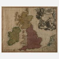 rechts oben prachtvolle Kartusche und hier bezeichnet "Magna Britania complectens Angliae, Scotiae et Hiberniae Regna ... Io. Bapt. Homann Norimberg Cum Privileg to S.C.M.", Darstellung von England mit Schottland und Irland sowie Teilen der Niederlande, kolorierter Kupferstich, um 1720, geringe Verluste, braunfleckig und leicht gebräunt, unter Passepartout und hinter Glas gerahmt, Darstellungsmaße ca. 47,5 x 57 cm. Künstlerinfo: dt. Kupferstecher, Verleger und Jesuit (1664 Kambach bis 1724 Nürnberg), vermutlich Schüler von David Funck, gründete um 1702 den eigenen Verlag "Homännisches Landkarten-Offizin", 1715 Mitglied der königlich preußischen Societät der Wissenschaften, Kaiser Karl VI. verlieh ihm den Titel eines "Kayserlichen Geographen" und der russische Zar Peter der Große ernannte Homann zum "Kayserlich russischen Agenten", tätig unter anderem in Wien, Leipzig und Nürnberg, Quelle: Thieme-Becker und Internet.