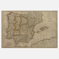 rechts oben bezeichnet "Spain and Portugal with Their General Divisions By Samuel Dunn, Mathematican. London: Printed for. Rob. Sayer. No. 53 in Fleet Street. as the Act directs 10. June 1786", Darstellung der iberischen Halbinsel mit Nachbarregionen bis hin nach Nordafrika, grenzkolorierter Kupferstich, gebräunt, unter Passepartout und hinter Glas gerahmt, Darstellungsmaße ca. 30 x 43 cm.