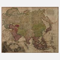links unten prachtvolle vielfigürliche Kartusche mit der Inschrift "Asiae Tecentissima Delineatio Qua Status et Imperiia Totius Orientis ... Authore Joh: Bapt: Homan no S.C.M. Geographo Noriberg", rechts oben Legende, Darstellung des asiatischen Kontinents mit Teilen von Europa, Australien und Nordwestafrika, kolorierter Kupferstich, um 1730, mittig Bugfalte mit kleineren Verlusten, gebräunt, unter Passepartout und hinter Glas gerahmt, Darstellungsmaße ca. 47,5 x 57,5 cm. Künstlerinfo: dt. Kupferstecher, Verleger und Jesuit (1664 Kambach bis 1724 Nürnberg), vermutlich Schüler von David Funck, gründete um 1702 den eigenen Verlag "Homännisches Landkarten-Offizin", 1715 Mitglied der königlich preußischen Societät der Wissenschaften, Kaiser Karl VI. verlieh ihm den Titel eines "Kayserlichen Geographen" und der russische Zar Peter der Große ernannte Homann zum "Kayserlich russischen Agenten", tätig unter anderem in Wien, Leipzig und Nürnberg, Quelle: Thieme-Becker und Internet.