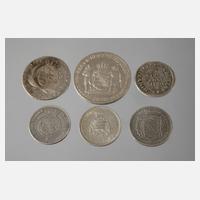 ein Taler Sachsen, Segen des Bergbaus, Johann König von Sachsen 1871 B, ss–geputzt; 1/3 Taler, vierzig eine Mark, Friedrich August von Sachsen 1810, s; 1/6 Taler, 84 eine Mark, Ernst Herzog zu Sachsen-Coburg-Gotha, 1852 F, ss+; 1/6 Taler, 180 ein Pfund, Johann König von Sachsen, 1865 B, ss++; 1/6 Taler, 84 eine Mark, Friedrich August König von Sachsen, 1842 G, ss; 1/24 Taler, Johann Georg IV von Sachsen, 1693, s.